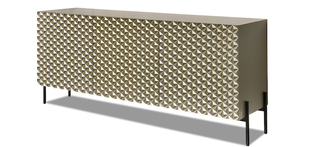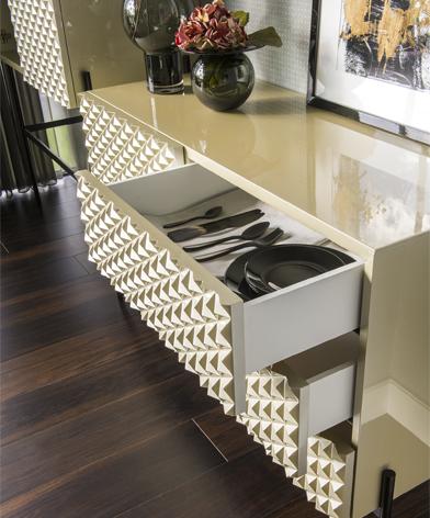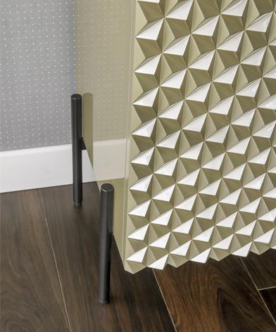 Интригующая, по-настоящему современная мебель, в дизайне которой сочетаются два противоположных качества: простота и декоративность. Простой каркас из нескольких металлических стержней – это, с одной стороны, массивная коробка с гладкими стенками, а с другой – декоративная фронтальная часть. Она изготовлена из толстой плиты с фрезерованным однородным рисунком – это очень ритмичный хрустальный шлиф, пробуждающий живую игру света и тени на поверхности.