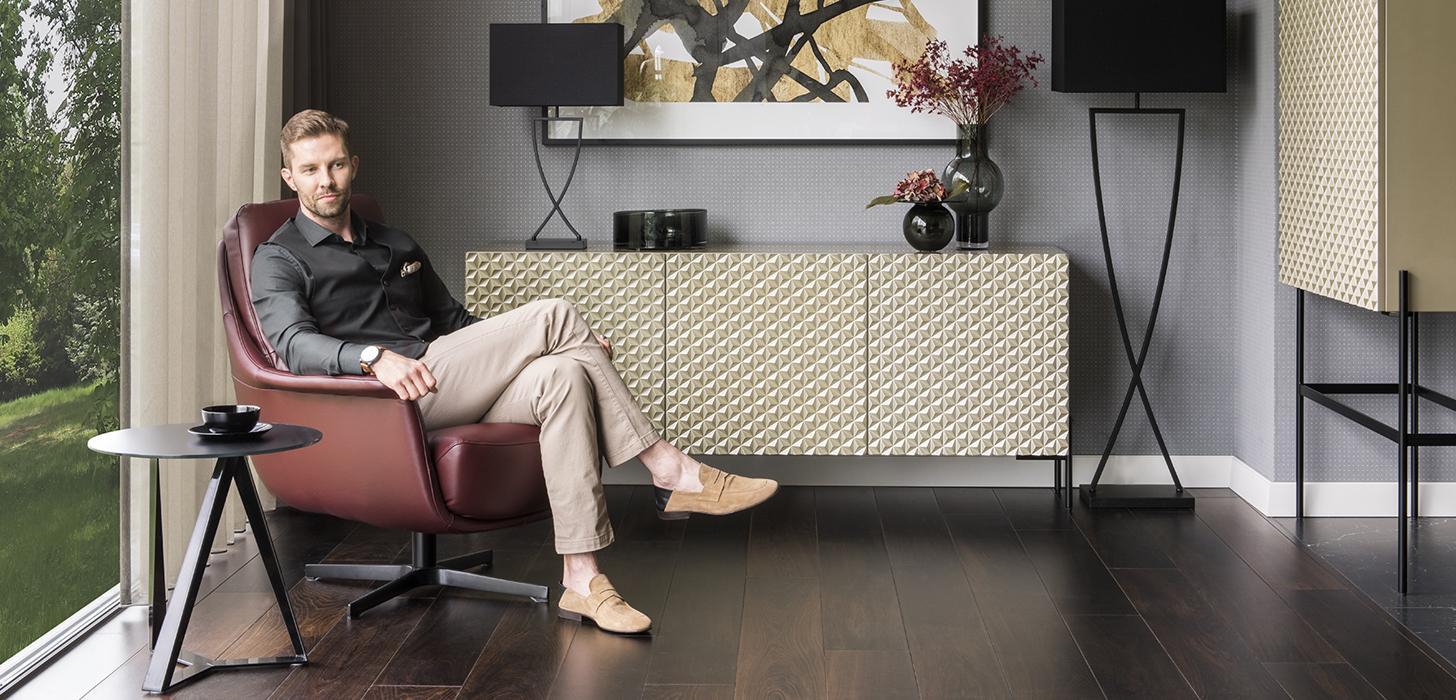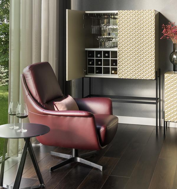 За исключением мини-бара, металлические ножки на внешней стороне корпуса (черные или золотые) могут быть заменены подставками типа slim edge или изготовленными из поликарбоната. Фасад и корпус мебели покрыты матовым или глянцевым лаком; в комплекте также можно приобрести прикроватную тумбочку.