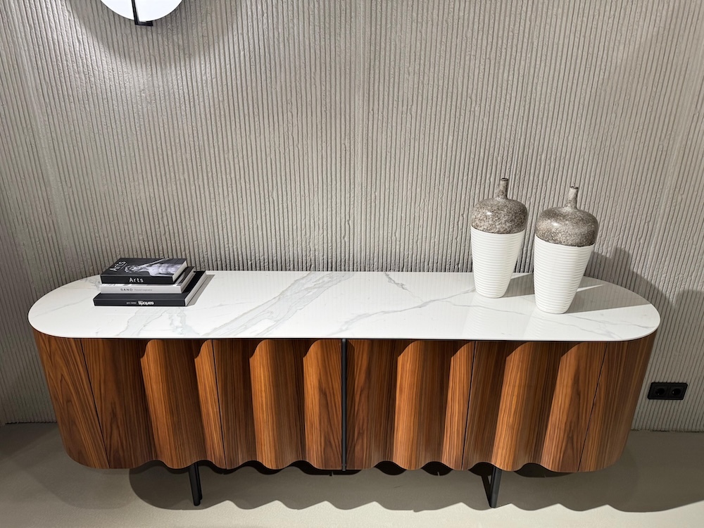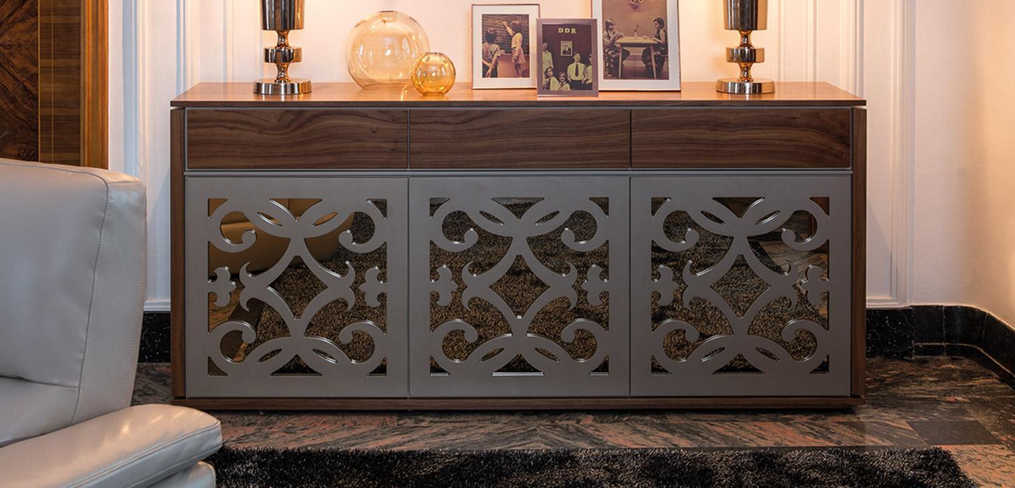 Гостиная MUSICA - это коллекция, выполненная из плотного МДФ и шпона американского ореха. В коллекции присутствуют буфеты для столовых групп, а также комоды, тумбы ТВ, прикроватные тумбочки.
