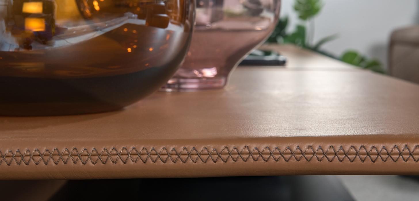 Качество изготовления восхищает: края столешницы обведены искусным крестообразным швом, а дверца изнутри и днища ящиков обиты мягкой искусственной кожей. Основа и металлические ножки окрашены.