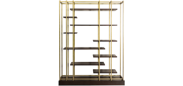 Стеллаж для гостиной, выполняющий исключительно декоративную функцию. Его форма — противоположность традиционному стеллажу. Она открыта со всех сторон, изготовлена из прямых металлических прутьев, расположенных асимметрично и в меняющемся ритме. Горизонтальные полки установлены на вертикальных прутьях — размещены фантазийно, различной длины и на различной высоте. Мебель создана для сувениров, безделушек, декоративных фигурок и посуды.