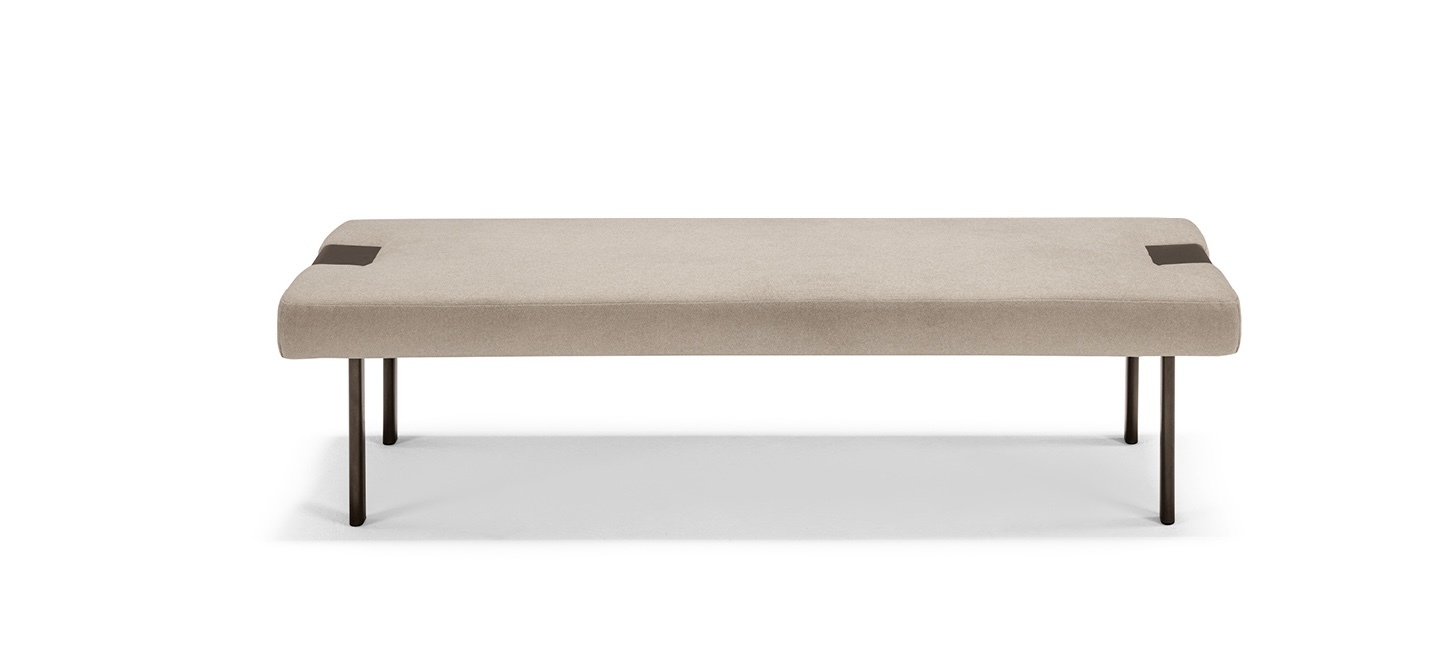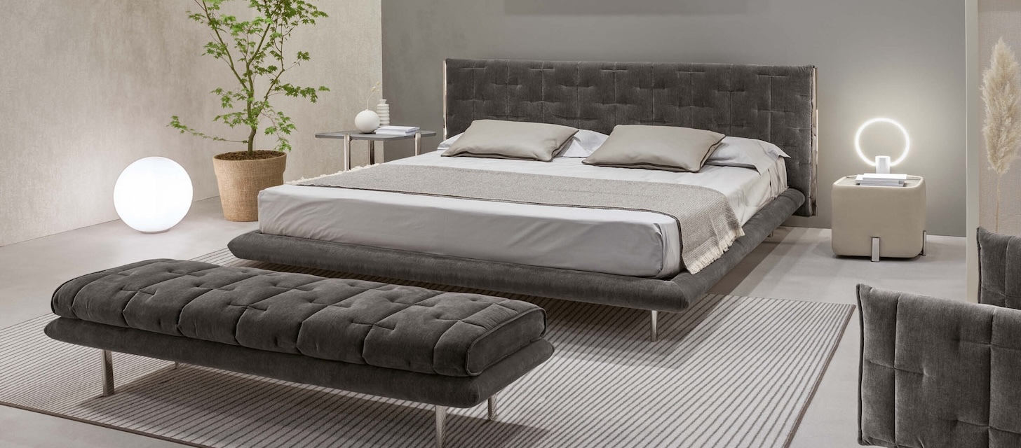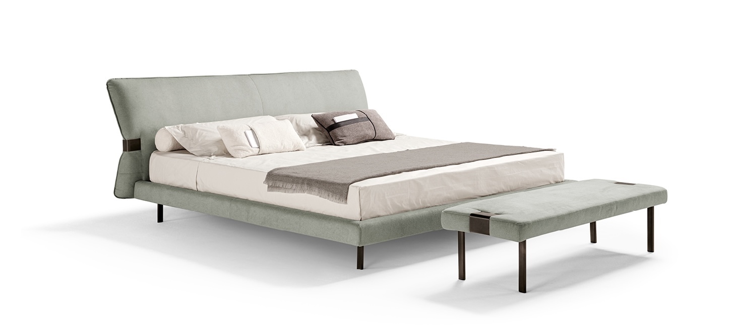 Кровать опирается на прочное мягкое основание, обитое той же тканью, что и изголовье, создавая ощущение стабильности и долговечности. Дополнительная скамья и пуф в тон.